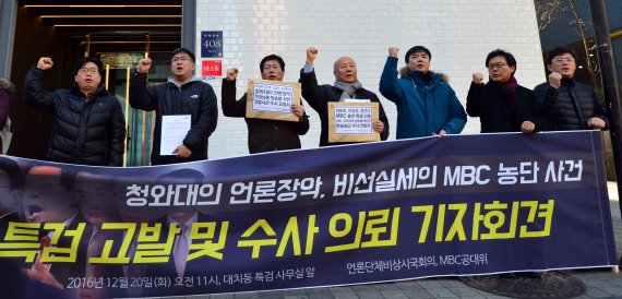 언론단체비상시국회의, MBC 공대위 관계자들이 20일 오전 서울 테헤란로 특검사무실 앞에서 열린 '청와대 언론장악, 비선 실세의 MBC 농단 사건 특검 고발 및 수사 의뢰' 기자회견에서 구호를 외치고 있다./사진=서동일 기자