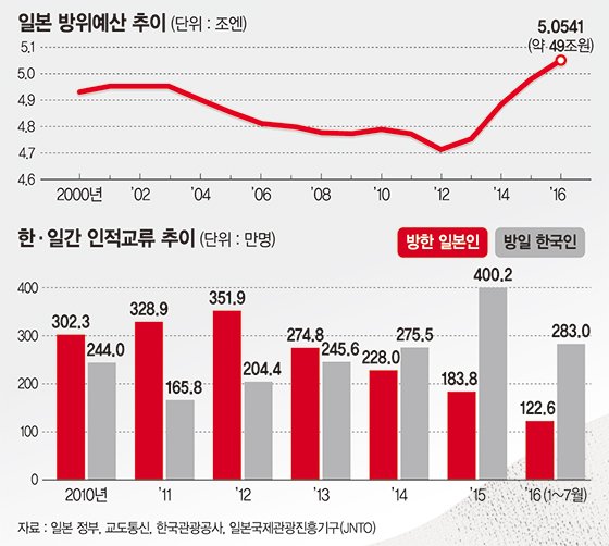 【 도쿄(일본)=박소연 기자】2016년 한 해 동안 한·일 교류는 겉으로 보기에는 양호했다. 일본을 찾은 우리나라 관광객이 사상 처음으로 500만명을 넘어설 것으로 보이고, 급감하던 방한 일본인 관광객 수도 성장세로 돌아섰다. 1일 한국관광공사와 일본정부관광국(JNTO)에 따르면 2016년 들어 10월까지 방일 한국인 관광객 수는 400만명을 돌파, 연말까지 500만명을 무리없이 넘길 것으로 전망된다. 2015년 방일 관광객이 전년 대비 45.3% 급증해 처음 400만명을 넘기고서도 더욱 많은 사람들이 일본을 찾았다.