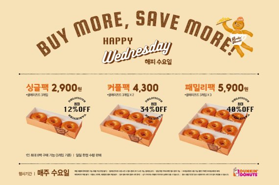 ‘해피 수요일’에 제공되는 도넛팩은 각각 글레이즈드 도넛이 3개, 6개, 9개 단위로 포장된 ‘싱글팩’, ‘커플팩’, ‘패밀리팩’ 총 3종이다. 혼자서도 부담 없이 즐길 수 있는 ‘싱글팩’은 2900원, 연인 또는 친구와 즐기기 좋은 ‘커플팩’은 4300원이다. 온 가족이 나눠먹을 수 있는 패밀리팩은 5900원이다.