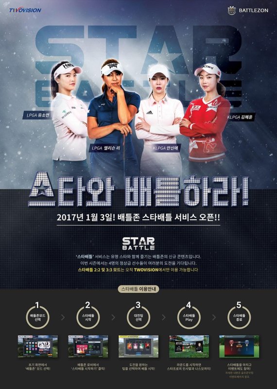 '휠라골프와 함께하는 배틀존 정규시즌4 스타배틀' 이벤트는 미국여자프로골프(LPGA)투어에서 활약 중인 유소연, 재미동포 앨리슨 리, KLPGA투어의 안신애, 김혜윤 선수 등 유명 스타와 함께 대결을 펼치는 신규 배틀존 서비스다. 이번 이벤트는 전국 골프존 비전플러스 및 투비전 설치 매장에서 진행된다. 각각 1인, 2인, 3인 스타배틀 라운드 종료 후 제공되는 스티커를 전부 모으면 경품 추첨 행사에 자동 응모된다. 단 2인 이상 스타배틀 플레이는 골프존 투비전을 통해서만 가능하다.