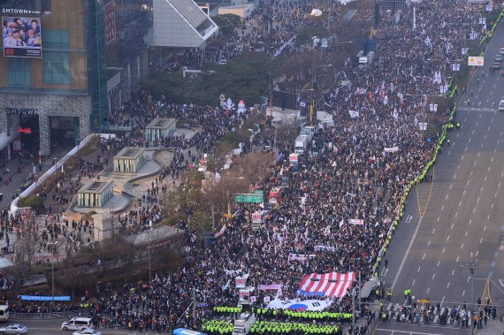 '대통령 탄핵기각을 위한 국민총궐기운동본부'(탄기국)는 7일 오후 서울 삼성동 코엑스 앞에서 예배와 집회를 열어 탄핵기각과 특검 수사 중단을 요구했다. 행사에 참석한 인원들이 구호를 외치며 강남역 쪽으로 이동하고 있다. '오직 정의와 진실이 이길 수 있도록 선동과 왜곡 탄핵 기각을 위한 국민총궐기 대집회'(태극기 집회)에 참석한 인원은 주최측 추산 100만명, 경찰은 이날 집회 일시점 최다 인원을 3만2천명으로 추산했다. 사진=박범준 기자