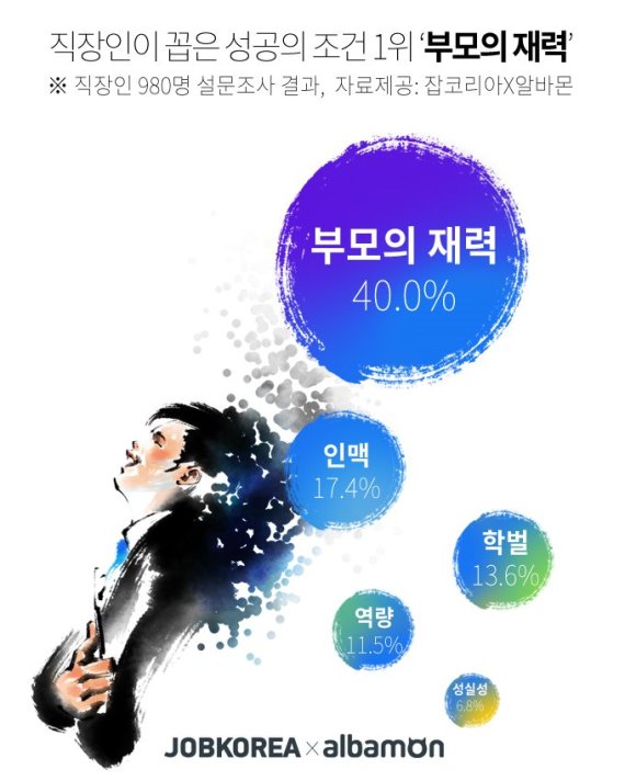 취업포털 잡코리아가 아르바이트 포털 알바몬과 함께 대학생과 직장인, 취업준비생 등 2030 성인 2,800명을 대상으로 '대한민국 성공의 조건'을 주제로 설문조사를 실시한 뒤 이같이 밝혔다. 잡코리아와 알바몬이 공동 설문조사에 참여한 2-30대 성인들에게 '대한민국에서 출세하고 성공하기 위해 가장 중요한 것이 무엇이라고 생각하는가'란 질문을 던졌다. 그 결과 응답자의 33.8%가 ▲경제적인 뒷받침, 부모의 재력을 가장 중요한 조건이라고 꼽아 1위를 차지했다.