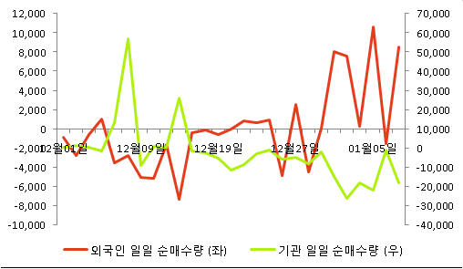 외국인 보유량 증가, 기관 감소 (5일 누적)
