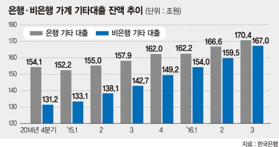 은행권 기타대출은 지난 2014년 말 154조1000억원에서 지난해 9월 말 170조4000억원으로 16조3000억원(10.58%) 늘어났다. 같은기간 131조2000억원이던 비은행권 기타대출 규모는 167조원까지 증가하면서 은행권 기타대출 규모에 육박했다.