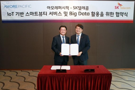 SK텔레콤과 아모레퍼시픽은 23일 서울 을지로 SK텔레콤 본사에서 ‘IoT기반 스마트 뷰티 서비스 및 빅데이터 활용’을 위한 상호양해각서(MOU)를 체결하고 본격 사업에 나서기로 했다.