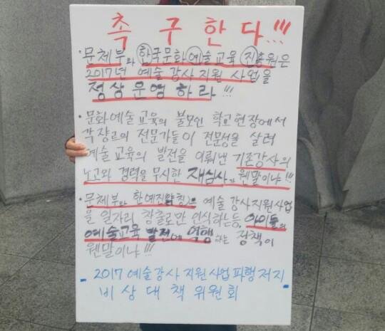 서범석 예술강사지원사업 파행저지 비상대책위원회 위원장은 "지난해 복지기관 문화예술교육 강사들도 재심사를 도입한 뒤 다수가 사실상 해고됐고 심사 기준도 불분명하다"며 "운영기관 선정이 지연되면서 학사 일정에도 차질이 생겨 강사들이 빨라야 4~5월에 학교 수업에 투입될텐데 강사들 수업시수가 줄면서 수입 감소를 비롯해 학생들도 예정된 수업을 못들어 피해를 보게 된다"고 지적했다.