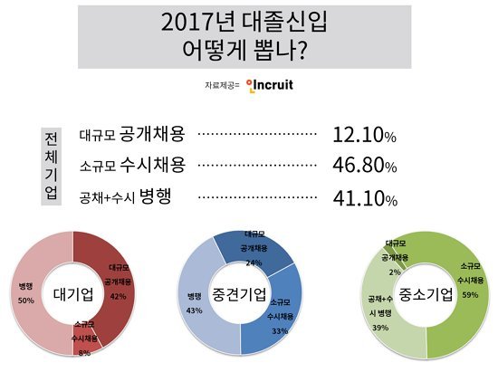 기업규모별는 올해에도 대기업은 정기채용 위주로 채용 전형을 진행하는 비중(42.0%)이 높았으며, 소규모 수시채용만을 진행한다고 밝힌 기업은 8.0%에 불과했다. 그럼에도 불구하고 공채와 수시채용을 병행할 것이라고 답한 대기업은 무려 절반(50.0%)의 비중을 보였다. 올 한 해 대기업들은 공채를 근간으로 두되, 실무에 바로 투입해야 하는 공석이 발생할 경우 수시채용으로 보강할 전망이다. 중견기업의 경우에는 '공채'와 '수시채용', '병행' 이 3가지 채용 전략 각각에 거의 유사한 비중을 둘 것으로 확인됐다. 구체적인 응답률은 공채가 24%, 수시채용이 33%, 병행한다는 의견이 43%로 나타났다. 상대적으로 중소기업은 비용문제뿐만 아니라 대규모 채용을 진행하는 과정에서 투입해야 하는 추가적인 리소스가 부담스럽다. 때문에 중소기업들은 적은 인원을 그때그때 채용하는 수시채용(59%)을 선호하는 경향이 강했다.