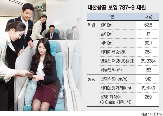대한항공의 보잉 787-9는 일등석 6석, 프레스티지석 18석, 일반석 245석 등 총 269석으로 구성됐다.