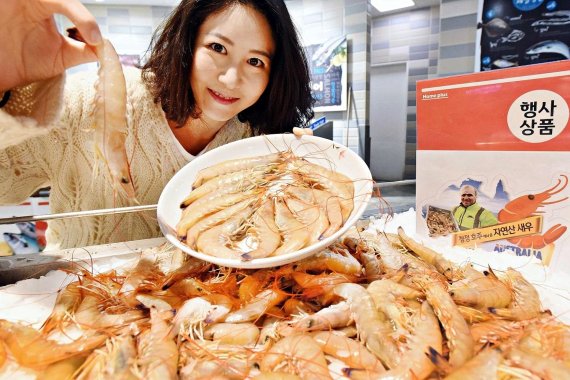 "탱탱한 육질 호주 자연산 엔베더 새우 맛보세요" 홈플러스는 청정해역인 호주 북부 카펀테리아만에서 자라는 자연산 '엔베더 새우'를 오는 31일까지 판매한다. 홈플러스 서울 강서점에서 모델이 엔데버 새우를 소개하고 있다.