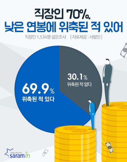 취업포털 사람인이 직장인 1534명을 대상으로 ‘본인의 낮은 연봉으로 위축된 경험’을 조사한 결과, 69.9%가 ‘경험이 있다’라고 답했다.
