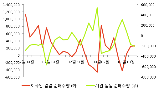 다음 표는 동종목의 외국인, 기관의 일별 순매수량을 나타낸 것이다.