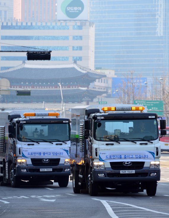 16일 오전 서울 세종대로 서울시청 앞에서 열린 특별 도로분진청소의 날 시범 행사에서 분진흡입청소차가 도로 위 먼지를 흡입하며 주행하고 있다./사진=서동일 기자