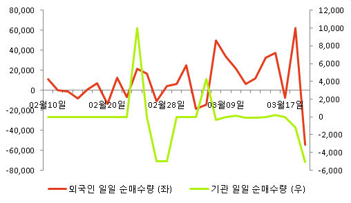 다음 표는 동종목의 외국인, 기관의 일별 순매수량을 나타낸 것이다.