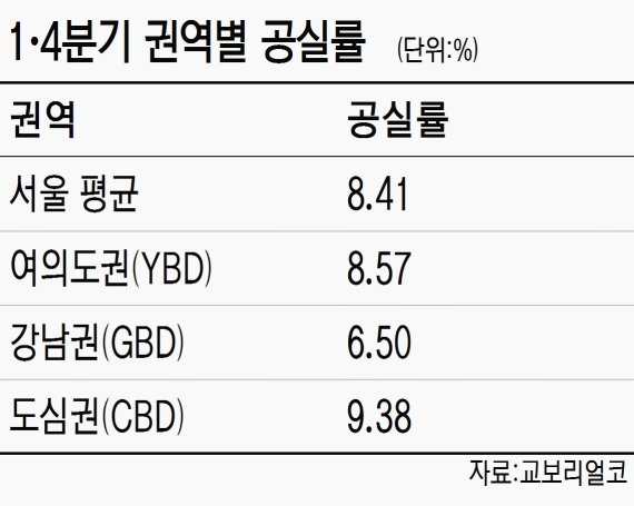 부동산 리서치 회사인 교보리얼코가 서울 시내 연면적 3300㎡ 지상 5층 이상 빌딩을 조사한 결과 올해 1.4분기 CBD와 GBD 오피스 공실률은 전분기 대비 각각 0.38%포인트, 0.41%포인트 하락한 9.38%, 6.5%를 기록했다.