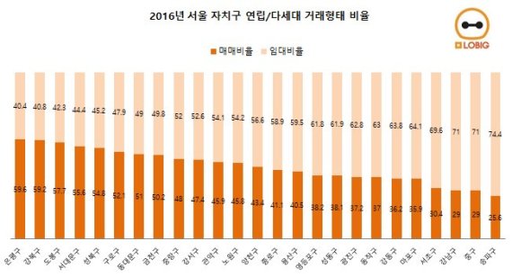 로빅을 서비스하는 ㈜케이앤컴퍼니의 구름 대표는 "지역별로 매매, 임대 비중에 차이가 나는 이유는 연립·다세대를 구매하는 목적이 다르기 때문"이라면서 "매매비중이 높은 은평구, 강북구는 자가 목적의 거래가 많은 반면, 임대비중이 높은 송파, 강남, 서초는 임대수익을 바라는 투자목적의 거래가 많은 것"이라고 말했다.