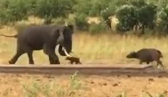 남아프리카공화국 크루거 국립공원에 살고 있던 버팔로는 물을 마시고 있던 중 코끼리가 접근하는 것을 느꼈다. 촬영된 화면을 보면 단순히 비교해도 어미 버팔로의 2배가 넘는 아프리카 코끼리였다.