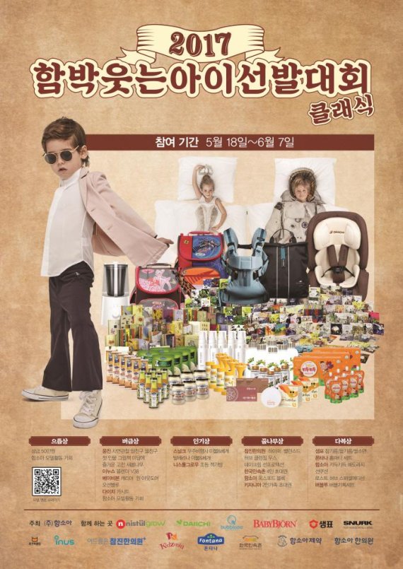 시상 내역은 △으뜸상-상금 50만원, 함소아 모델활동 기회 △버금상-웅진 자연관찰 땅친구 물친구, 첫인물 그림책 이담에, 즐거운 고전 새봄나무, 이누스 블렌더 V38 , 베이비뵨 캐리어 원 아웃도어 오션블루, 다이치 카시트, 함소아 모델활동 기회 △인기상-스널크 우주비행사 이불&베개, 발레리나 이불&베개, 니스툴그로우 초등 책가방 블루&핑크 △꿈나무상-참진한의원 하이퍼 밸런스드 허브 클렌징무스, 데이크림 선 프로텍션, 한국민속촌 4인 초대권, 함소아 한의원 옥스포드 블록, 키자니아 2인가족 초대권 △다복상-샘표 참기름, 들기름, 쌀소면, 폰타나 홈파티세트, 버블루 버블기획세트, 함소아제약 키득키득 배도라지, 선쿠션, 로스트 허브 스페셜에디션 등이다.