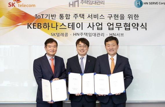SK텔레콤은 종합부동산관리회사 HN주택임대관리, 임대관리업체 HN서브 등과 함께 KEB하나스테이에 첨단 ICT 기반 생활편의 시설·서비스를 구축하는 내용의 공동이행협약(MOU)을 체결했다고 23일 밝혔다.