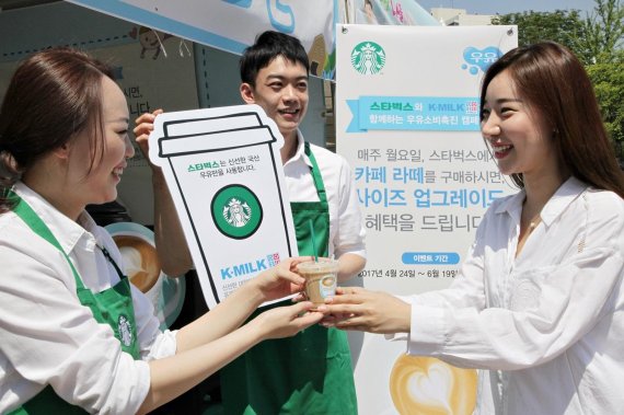 ‘2017우유사랑라떼’ 캠페인은 국산우유의 우수성을 알리고, 소비촉진에 기여한다는 공익적인 취지로 마련됐으며 4월 24일부터 6월 19일까지 매주 월요일마다 전국 1030여개 스타벅스 매장에서 ‘카페 라떼’를 구매하는 고객에게 한 사이즈 업그레이드 혜택을 제공하고 있다.