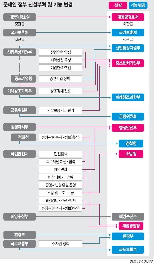개편은 최소화했지만 문 대통령의 공약사항들을 실천하기 위한 개편은 착실히 포함됐다. 해양경찰청과 소방청을 국민안전처로부터 분리하고, 재난 관련 기능은 행정안전부로 통합하고 재난 정책을 총괄할 차관급 재난안전관리 본부를 설치했으며, 차관급 조직인 중소기업청을 장관급 조직인 중소벤처기업부로 승격시킨 것이다. 4차 산업혁명 시대에 대비해 벤처창업을 독려하는 것은 물론 중소기업 지원을 강화해 일자리창출 효과도 노리기 위한 조치로 풀이된다.