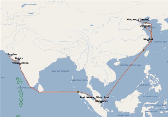 기항지는 천진, 청도, 닝보, 싱가포르, 포트켈랑, 나바셰바(인도), 문드라(인도), 하지라(인도), 콜롬보(스리랑카), 포트켈랑, 싱가포르, 천진 순이다.