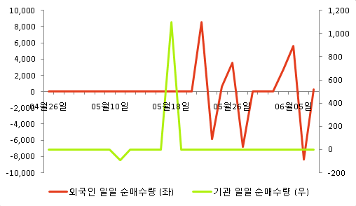 최근 5일간 동종목의 외국인 투자자는 242주 순매수하였고 마찬가지로 기관은 0주 순매수하였다. 전날 외국인은 242주 순매수했지만 기관은 순매수량이 0으로 보유비율 그대로 유지했다.