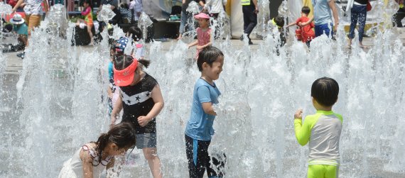 내륙지역을 중심으로 폭염특보가 내려진 18일 서울 광화문광장에서 어린이들이 물놀이를 하며 더위를 식히고 있다. 사진=김범석 기자