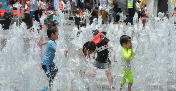 내륙지역을 중심으로 폭염특보가 내려진 18일 서울 광화문광장에서 어린이들이 물놀이를 하며 더위를 식히고 있다. 사진=김범석 기자