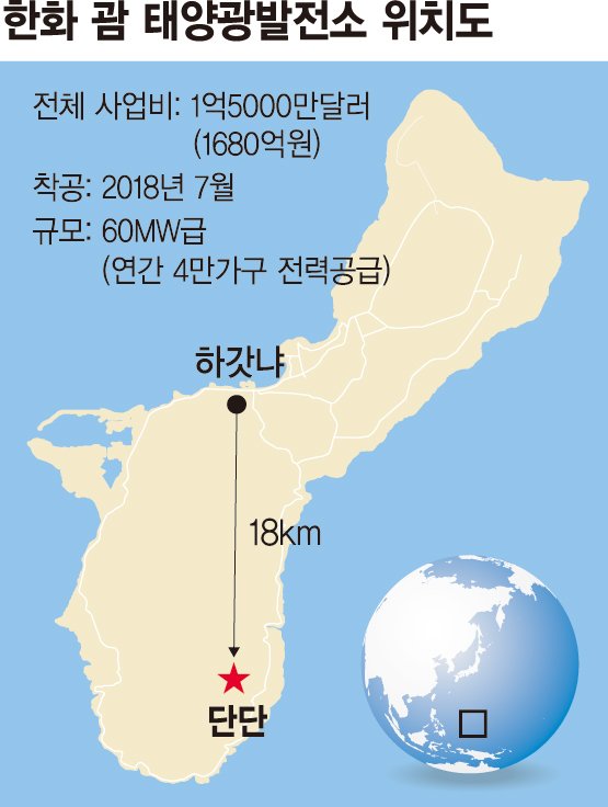 한화가 괌 절반 가구에 전력을 공급할 수 있는 대규모 태양광발전소를 건설한다. 특히, 이번 수주는 에너지저장장치(ESS)를 결합한 태양광발전소 건립으로는 세계 최대 규모로 한화의 새로운 발전사업 모델로 기대되고 있다.