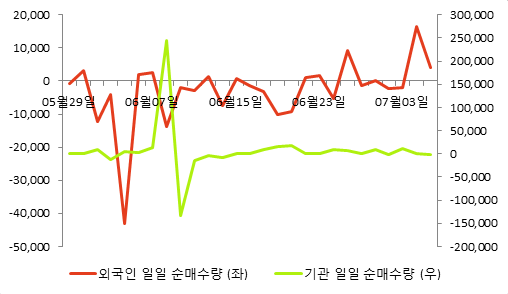 7월4일부터 전일까지 외국인이 2거래일 연속 순매수를 보였다. 4주간을 기준으로 보면 기관이 방향성있는 매매를 하면서 179,345주를 순매수한 반면, 외국인은 매도 후 매수의 관점을 보이고 있음에도 불구하고 23,600주를 순매도했고, 개인들도 매도쪽으로 방향을 잡으면서 155,745주를 순매도했다.