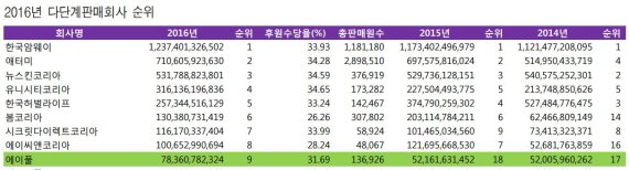 토러스투자증권은 이중 9위의 에이풀에 주목했다. 코스닥상장사 현성바이탈의 자회사이면서 2015년 18위에서 지난해 9위로 1년만에 9계단 상승했기 때문이다.