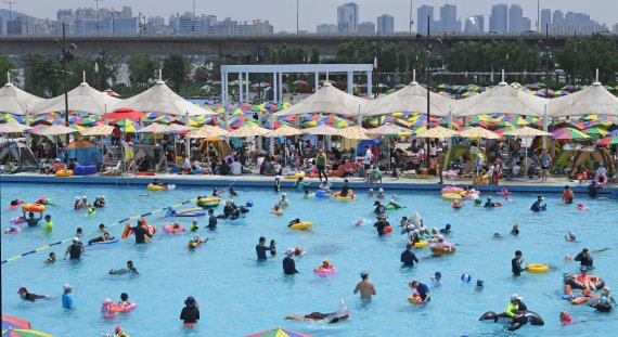 본격적인 여름 휴가철인 30일 서울 여의도 한강시민공원 수영장에서 시민들이 더위를 식히고 있다. 사진=