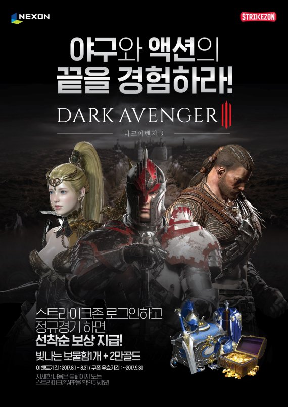 스크린야구 브랜드 스트라이크존을 운영하는 ㈜뉴딘콘텐츠는 넥슨의 최신 모바일 게임 ‘다크어벤저3’와 제휴 이벤트를 진행한다고 1일 밝혔다.