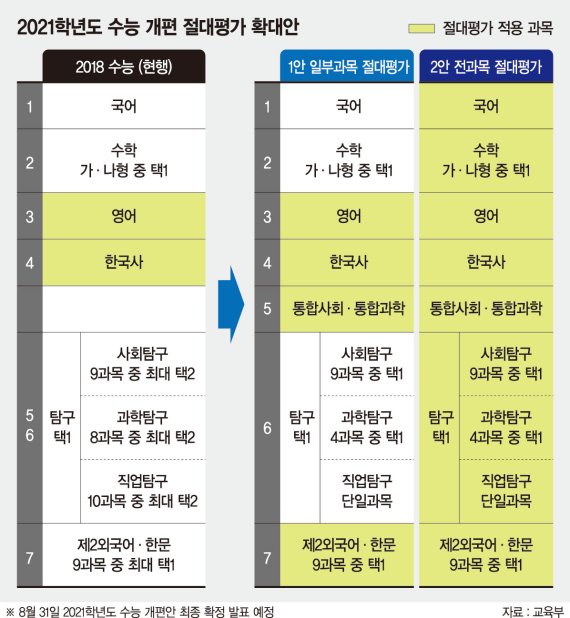 현재의 중3 학생들이 치를 2021학년도 대학수학능력평가시험에서 절대평가가 확대된다. 통합사회와 통합과학이 신설돼 절대평가로 치러지고 제2외국어와 한문도 절대평가제가 도입된다. 현재 절대평가로 시행 중인 영어와 한국사 외에 국어와 수학, 탐구영역은 오는 31일까지 절대평가 시행 여부를 결정한다.
