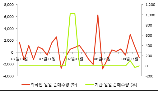 최근 5일간 동종목의 외국인 투자자는 3,101주 순매수하였고 마찬가지로 기관은 0주 순매수하였다. 전날 외국인은 898주 순매도했지만 기관은 순매수량이 0으로 보유비율 그대로 유지했다.