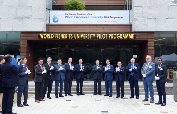 해양수산부와 부산시, 부경대는 7일 오후 부산 남구 부경대 대학본부 2층 대회의실에서 FAO(UN식량농업기구) 산하 국제기구인 '세계수산대학원'의 시범사업 개원식을 가졌다. 이날 개원식에는 강준석 해양수산부 차관, 서병수 부산시장, 김영섭 부경대 총장, 김정훈 국회의원, 백종헌 부산시의회 의장, 그리고 해외에서 임기택 IMO(국제해사기구) 사무총장과 FAO 개도국 회원국 의장 등 국제기구 및 FAO 회원국 대표 200여명이 참석했다. 개원식을 축하하며 참석자들이 박수를 치고 있다.