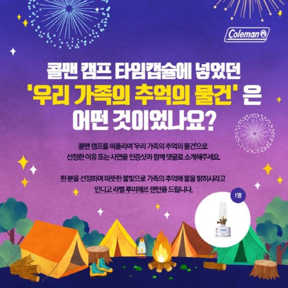 한대웅 콜맨코리아 마케팅팀 이사는 “타임캡슐 만들기는 지난 콜맨 캠프의 다양한 프로그램 중에서도 가족 단위 참가자들의 호응이 가장 높았던 것 중에 하나”라며 “이번 이벤트를 통해 가족과 함께 한 콜맨 캠프의 추억을 떠올리길 바라며, 나아가 콜맨이 사랑하는 고객분들의 가족과 친구간의 관계에 따뜻한 불을 밝히는 매개체가 되길 바란다”고 전했다.