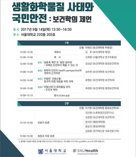 발표는 △’살충제 계란’과 ‘발암 생리대’, 위해성 논란에서 배울 수 있는 것 - 김성균 교수(보건대학원 환경보건학과) △화학적 안전의 의료관점과 역학적 근거마련 - 성주헌 교수(보건대학원 보건학과) △‘위험한’ 위험소통: 효과적 위험 대응을 위한 과제 - 유명순 교수(보건대학원 보건학과) △‘위험사회’의 화학물질 관리, 도전과 제언 -최경호 교수(보건대학원 환경보건학과) 등으로 구성된다.