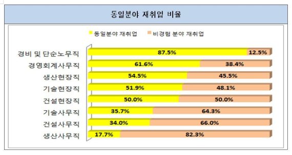 분야별 동일직무 재취업 비율은 △경비 및 단순노무직이 87.5%로 가장 높고, △경영회계사무직 61.6%, △생산현장직 54.5%, △기술현장직 51.9% 순이었으며, 생산사무직이 17.7%로 가장 낮았다.