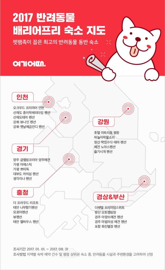 여기어때는 지난 1~8월 사이 반려동물 동반 가능 숙소의 예약 건수를 바탕으로 가장 예약 거래가 높은 지역 5곳을 선정했다. 올해 펫팸족이 가장 많이 방문한지역은 경기, 인천, 강원,충청, 경상&부산이었다. 여기어때는 이 지역에서 예약 건수와 사용자 리얼리뷰, 소셜네트워크서비스(SNS) 및 온라인 반응, 숙소의반려 동물 시설과 주변 환경을 고려해 숙소 총 25곳을 선정했다.