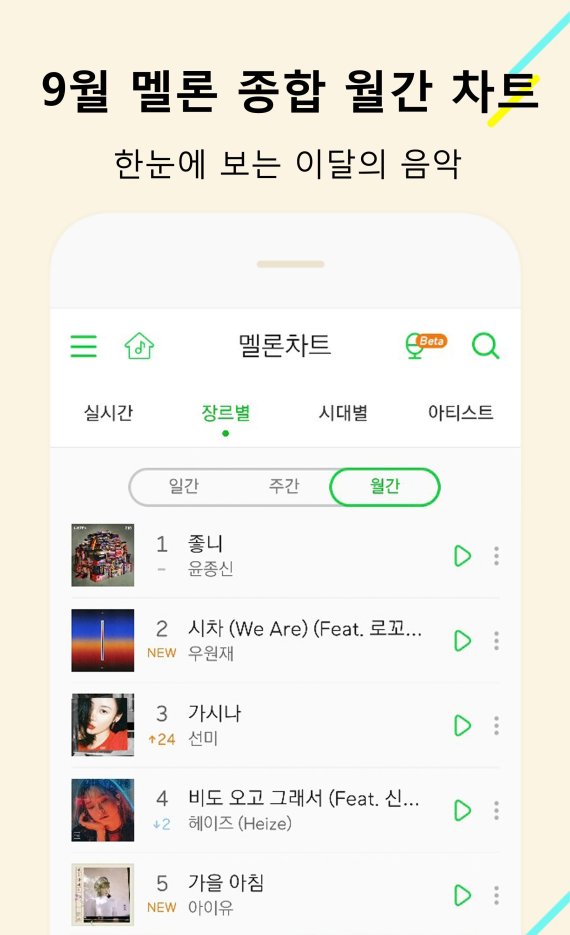 지난 9월 멜론 월간 종합 차트 1위는 윤종신의 '좋니'였고 2위는 우원재의 '시차(We Are)(Feat. 로꼬 & GRAY)', 3위는 선미의 '가시나' 4위는 헤이즈(Heize)의 '비도 오고 그래서(Feat. 신용재)', 5위는 아이유의 '가을 아침' 순이었다.