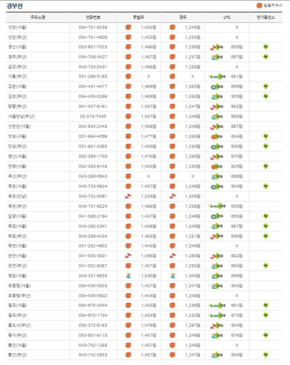 액화석유가스(LPG)의 경우 서울 방향 언양휴게소의 알뜰주유소 가격이 829원으로 가장 저렴했고, 부산 방향 김천휴게소의 GS칼텍스가 929원에 판매해 가장 비쌌다.