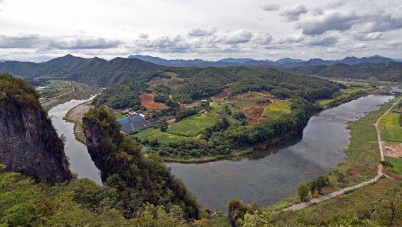 굽이굽이 강줄기에 홀로 고고한 선돌
