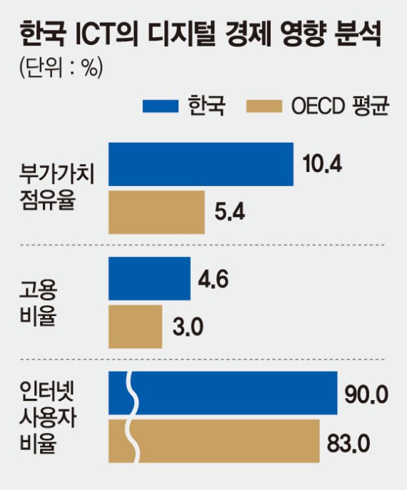 OECD 보고서를 통해 ICT가 한국 경제 성장의 핵심 축이라는 것이 재차 확인됐다. 한국의 ICT 산업 부가가치는 전체 산업 부가가치의 10.4%로 OECD 회원국 중 가장 큰 비중을 차지했다. 한국에 이어서는 스웨덴, 핀란드, 미국 등이 상위권에 올랐다.
