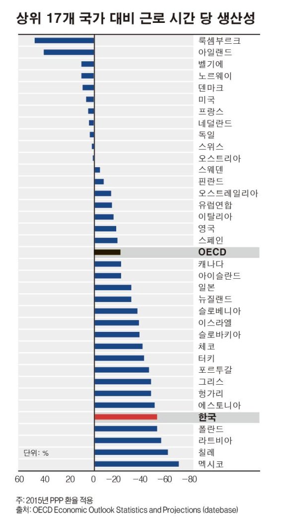 2015년 OECD가 조사한 ‘상위 17개 국가 대비 근로 시간당 생산성'을 살펴보면 한국은 전체 35개국 가운데 33위를 기록했다. 이는 최근 경제위기를 겪고 있는 그리스 보다 낮은 수준이다. 우리나라의 시간당 생산성은 -52% 수준으로 OECD 평균인 -20% 선의 절반에도 못 미치는 수준이다.