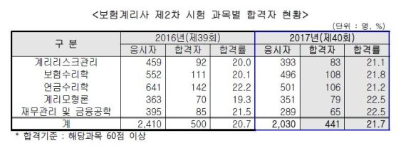 2017년 제 40회 보험계리사 및 손해사정사 2차 시험 결과 총 603명의 최종 합격했다. 합격률은 전년도와 비슷한 수준이다.