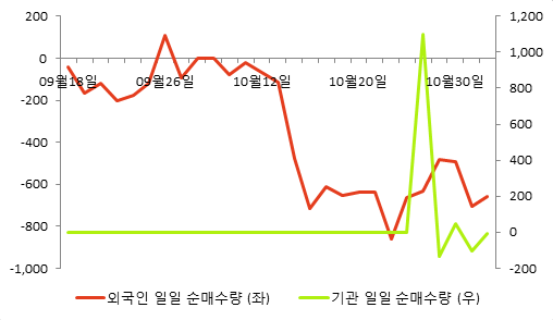 기관/개인 순매수, 외국인은 순매도(한달누적)
