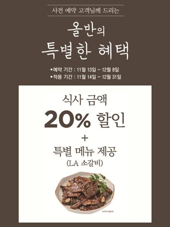 한식 뷔페 올반은 오는 13일부터 12월 8일까지 성인 20명 이상 단체모임을 사전 예약하고 연말까지 매장을 방문할 경우 20% 할인혜택과 올반 LA소갈비를 서비스로 제공한다. 오는 20일부터는 레드 와인 '코노수르 1551 께베르네쇼비뇽'과 화이트 와인 '코노수르 1551 샤도네이' 중 1병과 LA 소갈비로 구성된 세트를 특별 할인가인 2만2900원에 판매한다.