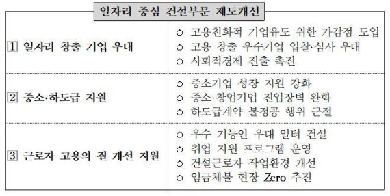 이와함께 숙련 기능인을 육성·우대하는 건설품질 명장제 도입, 장기 재직 중소기업 핵심인력을 지원하는 내일채움공제사업, 건설 숙련기능인력에게 인센티브를 주는 우수기능인 선정제도 도입 등을 통해 중소기업 근로자의 고용을 지원한다.