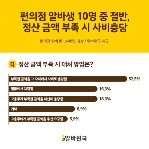 또 편의점 아르바이트 근무 중 최저임금(6470원)도 받지 못한 알바생도 44.7%에 달했다.